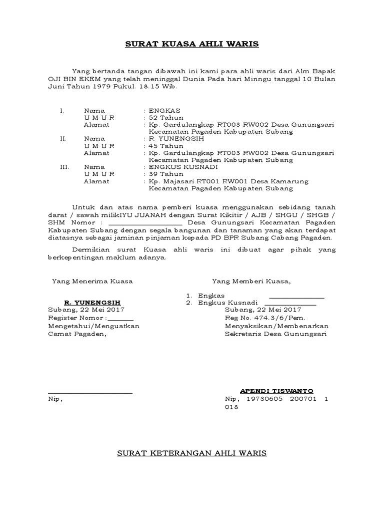 Membuat surat kuasa ahli waris untuk jual beli tanah memang sulit, apalagi jika kita tidak pernah melihat contoh surat kuasa tanah sebelumnya. Surat kuasa ini sangat di butuhkan oleh penerima ahli waris. Pemberi kuasa dan penerima kuasa adalah para ahli waris dari saudara (alm) bapak h. Surat kuasa ahli waris ii no. Sebab, urusan warisan memang bisa memecah belah keharmonisan keluarga.